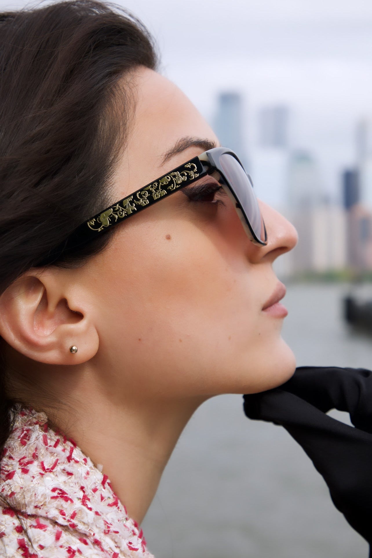 Black over Tokyo Tortoise Acetate, Shiny Gold Floral/Butterfly Metal Inlay On Outside Temples, Brown Gradient Lens