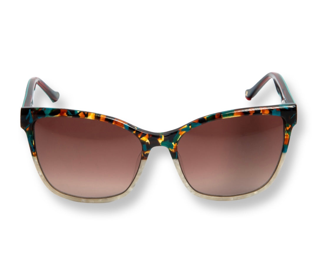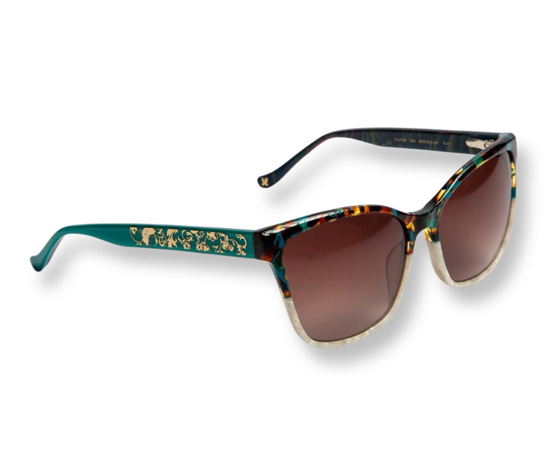 Teal-Green Tortoise/Bone Marble Front Custom Lamination Acetate, Teal over Navy/gold Acetate Temples, Shiny Gold Floral/Butterfly Metal Inlay On Outside Temples, Brown Gradient Lens